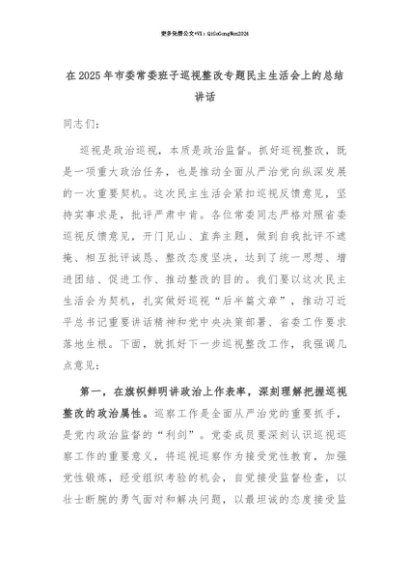 【七哥公文】2025年:【七哥公文】在2025年市委常委班子巡视整改专题民主生活会上的总结讲话+更多免费公文+VX:QiGeGongWen2024+更多免费公文+VX:QiGeGongWen2024