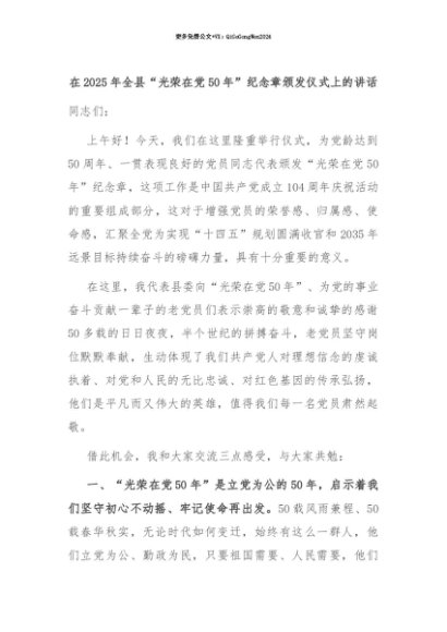 【七哥公文】2025年:【七哥公文】在2025年全县“光荣在党50年”纪念章颁发仪式上的讲话+更多免费公文+VX:QiGeGongWen2024+更多免费公文+VX:QiGeGongWen2024