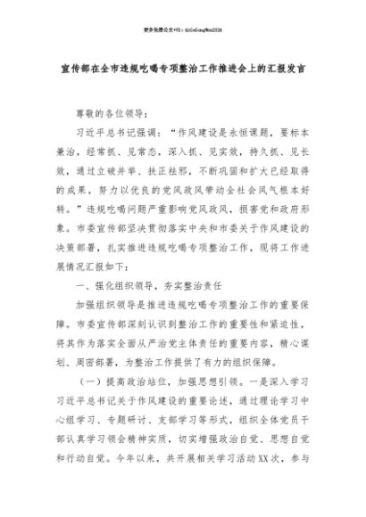 【七哥公文】2025年:【七哥公文】宣传部在全市违规吃喝专项整治工作推进会上的汇报发言+更多免费公文+VX:QiGeGongWen2024+更多免费公文+VX:QiGeGongWen2024