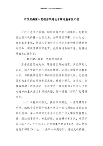 【七哥公文】2025年:【七哥公文】市国资委深入贯彻作风建设专题进展情况汇报+更多免费公文+VX:QiGeGongWen2024+更多免费公文+VX:QiGeGongWen2024