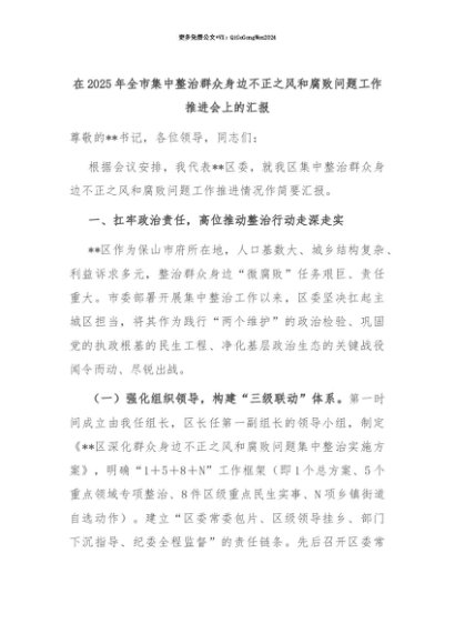 【七哥公文】2025年:【七哥公文】在2025年全市集中整治群众身边不正之风和腐败问题工作推进会上的汇报+更多免费公文+VX:QiGeGongWen2024+更多免费公文+VX:QiGeGongWen2024