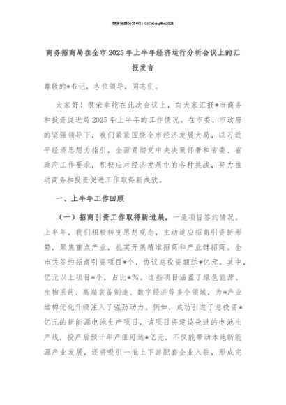 【七哥公文】2025年:【七哥公文】商务招商局在全市2025年上半年经济运行分析会议上的汇报发言+更多免费公文+VX:QiGeGongWen2024+更多免费公文+VX:QiGeGongWen2024