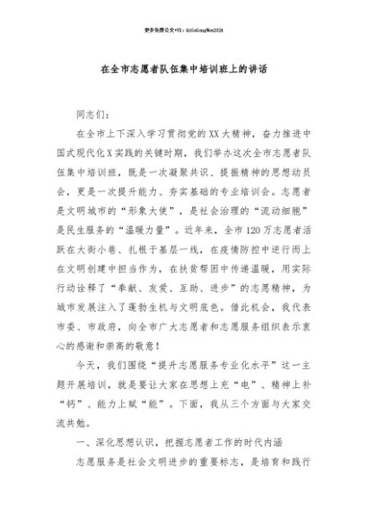 【七哥公文】2025年:【七哥公文】在全市志愿者队伍集中培训班上的讲话+更多免费公文+VX:QiGeGongWen2024+更多免费公文+VX:QiGeGongWen2024