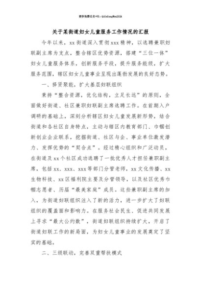 【七哥公文】2025年:【七哥公文】关于某街道妇女儿童服务工作情况的汇报+更多免费公文+VX:QiGeGongWen2024+更多免费公文+VX:QiGeGongWen2024