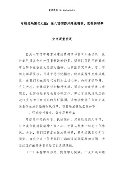 【七哥公文】2025年:【七哥公文】专题进展情况汇报:深入贯彻作风建设精神,助推供销事业高质量发展+更多免费公文+VX:QiGeGongWen2024+更多免费公文+VX:QiGeGongWen2024