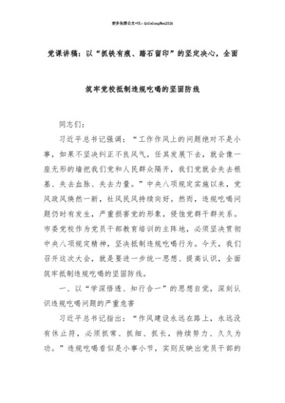 【七哥公文】2025年:【七哥公文】党课讲稿:以“抓铁有痕、踏石留印”的坚定决心,全面筑牢党校抵制违规吃喝的坚固防线+更多免费公文+VX:QiGeGongWen2024+更多免费公文+VX:QiGeGongWen2024