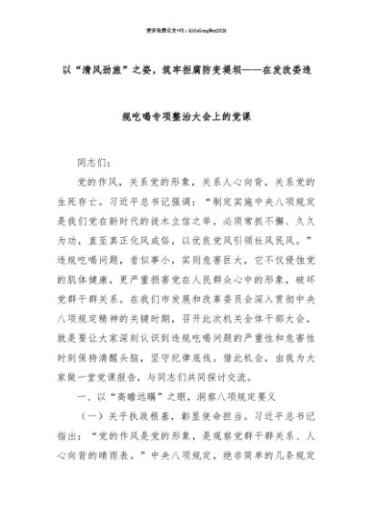 【七哥公文】2025年:【七哥公文】以“清风劲旅”之姿,筑牢拒腐防变堤坝——在发改委违规吃喝专项整治大会上的党课+更多免费公文+VX:QiGeGongWen2024+更多免费公文+VX:QiGeGongWen2024