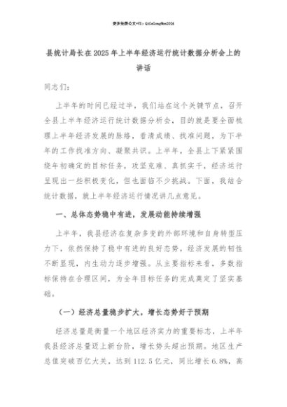 【七哥公文】2025年:【七哥公文】县统计局长在2025年上半年经济运行统计数据分析会上的讲话+更多免费公文+VX:QiGeGongWen2024+更多免费公文+VX:QiGeGongWen2024