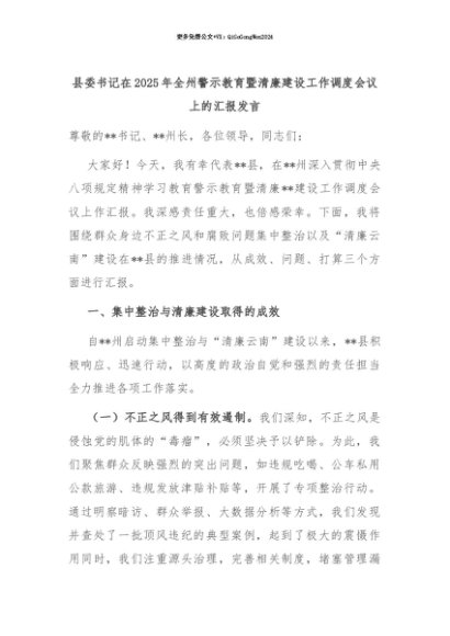 【七哥公文】2025年:【七哥公文】县委书记在2025年全州警示教育暨清廉建设工作调度会议上的汇报发言+更多免费公文+VX:QiGeGongWen2024+更多免费公文+VX:QiGeGongWen2024