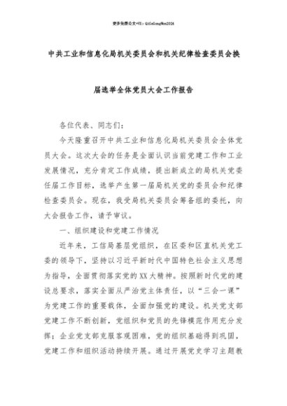 【七哥公文】2025年:【七哥公文】中共工业和信息化局机关委员会和机关纪律检查委员会换届选举全体党员大会工作报告+更多免费公文+VX:QiGeGongWen2024+更多免费公文+VX:QiGeGongWen2024