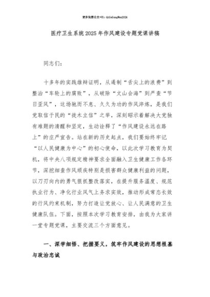 【七哥公文】2025年:【七哥公文】医疗卫生系统2025年作风建设专题党课讲稿+更多免费公文+VX:QiGeGongWen2024+更多免费公文+VX:QiGeGongWen2024