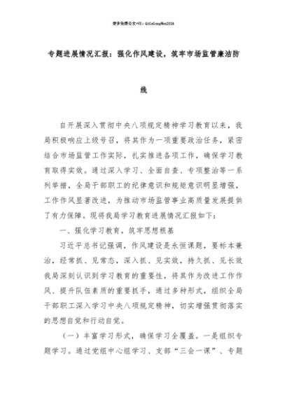 【七哥公文】2025年:【七哥公文】专题进展情况汇报:强化作风建设,筑牢市场监管廉洁防线+更多免费公文+VX:QiGeGongWen2024+更多免费公文+VX:QiGeGongWen2024