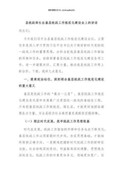 【七哥公文】2025年:【七哥公文】县统战部长在基层统战工作规范化建设会上的讲话+更多免费公文+VX:QiGeGongWen2024+更多免费公文+VX:QiGeGongWen2024