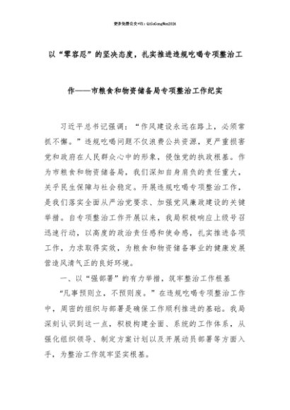 【七哥公文】2025年:【七哥公文】以“零容忍”的坚决态度,扎实推进违规吃喝专项整治工作——市粮食和物资储备局专项整治工作纪实+更多免费公文+VX:QiGeGongWen2024+更多免费公文+VX:QiGeGongWen2024