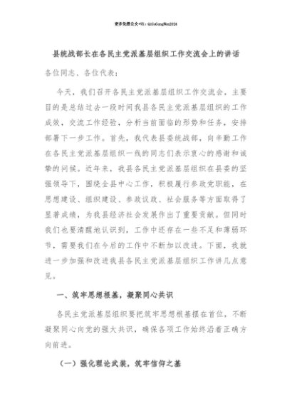 【七哥公文】2025年:【七哥公文】县统战部长在各民主党派基层组织工作交流会上的讲话+更多免费公文+VX:QiGeGongWen2024+更多免费公文+VX:QiGeGongWen2024