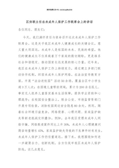 【七哥公文】2025年:【七哥公文】区妇联主任在未成年人保护工作联席会上的讲话+更多免费公文+VX:QiGeGongWen2024+更多免费公文+VX:QiGeGongWen2024