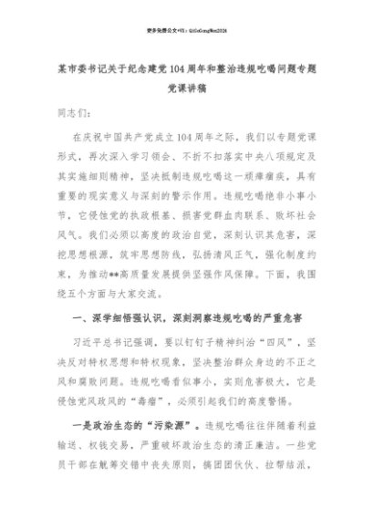 【七哥公文】2025年:【七哥公文】某市委书记关于纪念建党104周年和整治违规吃喝问题专题党课讲稿+更多免费公文+VX:QiGeGongWen2024+更多免费公文+VX:QiGeGongWen2024