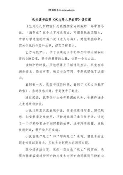 【七哥公文】2025年:【七哥公文】机关读书活动《乞力马扎罗的雪》读后感+更多免费公文+VX:QiGeGongWen2024+更多免费公文+VX:QiGeGongWen2024