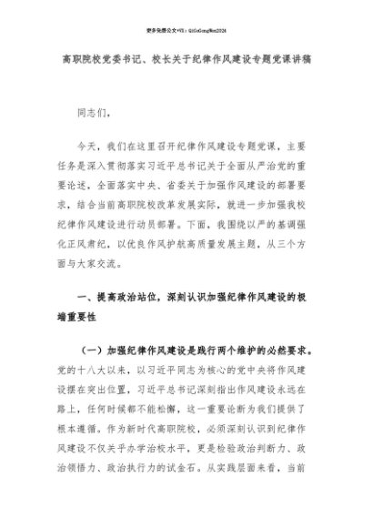 【七哥公文】2025年:【七哥公文】高职院校党委书记、校长关于纪律作风建设专题党课讲稿+更多免费公文+VX:QiGeGongWen2024+更多免费公文+VX:QiGeGongWen2024