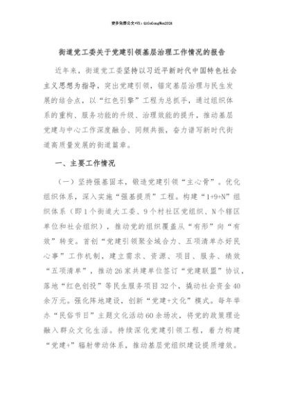 【七哥公文】2025年:【七哥公文】街道党工委关于党建引领基层治理工作情况的报告+更多免费公文+VX:QiGeGongWen2024+更多免费公文+VX:QiGeGongWen2024
