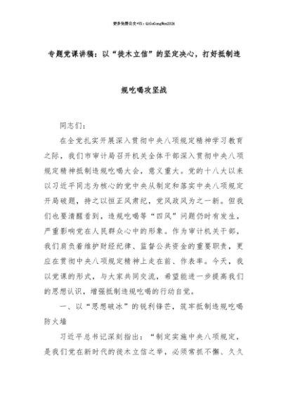 【七哥公文】2025年:【七哥公文】专题党课讲稿:以“徙木立信”的坚定决心,打好抵制违规吃喝攻坚战+更多免费公文+VX:QiGeGongWen2024+更多免费公文+VX:QiGeGongWen2024