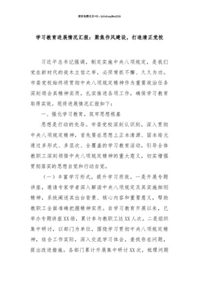 【七哥公文】2025年:【七哥公文】学习教育进展情况汇报:聚焦作风建设,打造清正党校+更多免费公文+VX:QiGeGongWen2024+更多免费公文+VX:QiGeGongWen2024