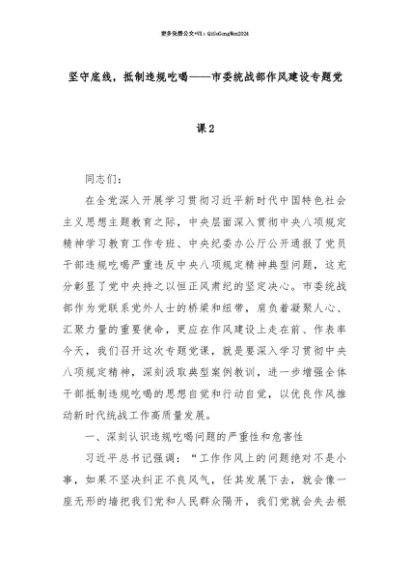 【七哥公文】2025年:【七哥公文】坚守底线,抵制违规吃喝——市委统战部作风建设专题党课2+更多免费公文+VX:QiGeGongWen2024+更多免费公文+VX:QiGeGongWen2024