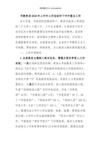 【七哥公文】2025年:【七哥公文】市教育局2025年上半年工作总结和下半年重点工作+更多免费公文+VX:QiGeGongWen2024+更多免费公文+VX:QiGeGongWen2024