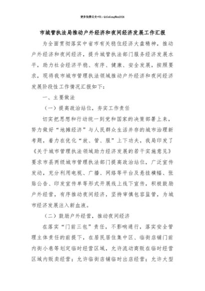 【七哥公文】2025年:【七哥公文】市城管执法局推动户外经济和夜间经济发展工作汇报+更多免费公文+VX:QiGeGongWen2024+更多免费公文+VX:QiGeGongWen2024