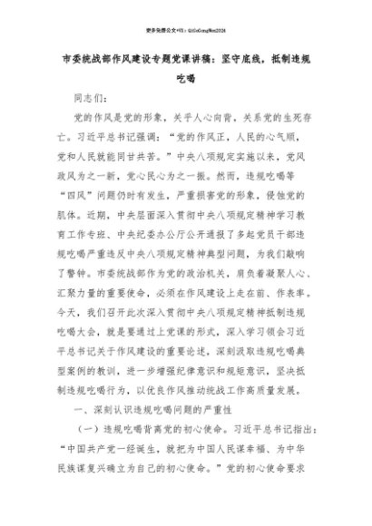 【七哥公文】2025年:【七哥公文】市委统战部作风建设专题党课讲稿:坚守底线,抵制违规吃喝+更多免费公文+VX:QiGeGongWen2024+更多免费公文+VX:QiGeGongWen2024
