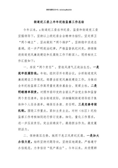 【七哥公文】2025年:【七哥公文】街道纪工委上半年纪检监察工作总结+更多免费公文+VX:QiGeGongWen2024+更多免费公文+VX:QiGeGongWen2024
