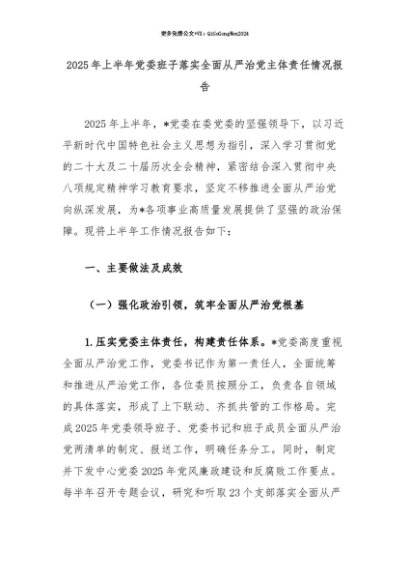 【七哥公文】2025年:【七哥公文】2025年上半年党委班子落实全面从严治党主体责任情况报告+更多免费公文+VX:QiGeGongWen2024+更多免费公文+VX:QiGeGongWen2024