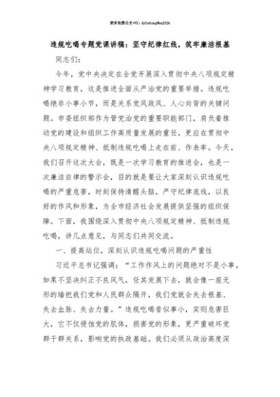【七哥公文】2025年:【七哥公文】违规吃喝专题党课讲稿:坚守纪律红线,筑牢廉洁根基+更多免费公文+VX:QiGeGongWen2024+更多免费公文+VX:QiGeGongWen2024