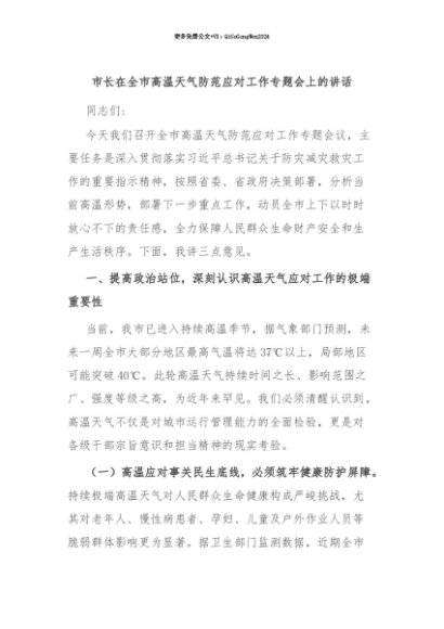 【七哥公文】2025年:【七哥公文】市长在全市高温天气防范应对工作专题会上的讲话+更多免费公文+VX:QiGeGongWen2024+更多免费公文+VX:QiGeGongWen2024