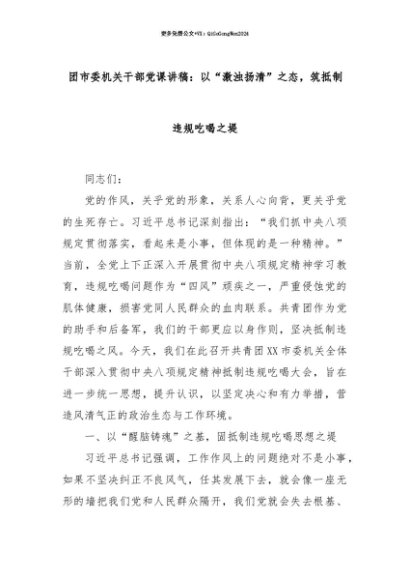 【七哥公文】2025年:【七哥公文】团市委机关干部党课讲稿:以“激浊扬清”之态,筑抵制违规吃喝之堤+更多免费公文+VX:QiGeGongWen2024+更多免费公文+VX:QiGeGongWen2024
