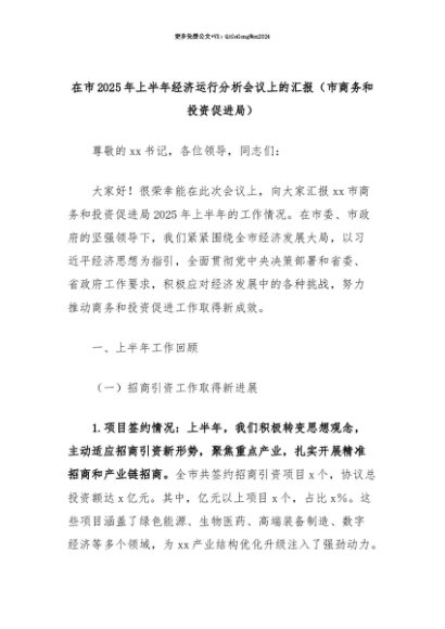 【七哥公文】2025年:【七哥公文】在市2025年上半年经济运行分析会议上的汇报(市商务和投资促进局)+更多免费公文+VX:QiGeGongWen2024+更多免费公文+VX:QiGeGongWen2024