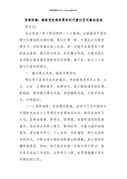 【七哥公文】2025年:【七哥公文】党课讲稿:锤炼党性修养勇担时代重任坚守廉洁底线+更多免费公文+VX:QiGeGongWen2024+更多免费公文+VX:QiGeGongWen2024