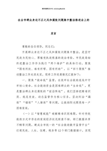 【七哥公文】2025年:【七哥公文】在全市群众身边不正之风和腐败问题集中整治推进会上的发言+更多免费公文+VX:QiGeGongWen2024+更多免费公文+VX:QiGeGongWen2024