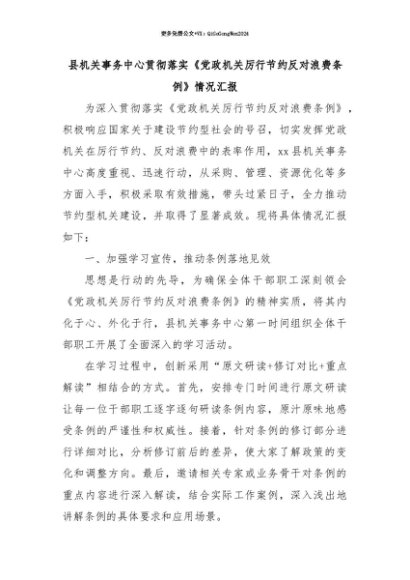 【七哥公文】2025年:【七哥公文】县机关事务中心贯彻落实《党政机关厉行节约反对浪费条例》情况汇报+更多免费公文+VX:QiGeGongWen2024+更多免费公文+VX:QiGeGongWen2024
