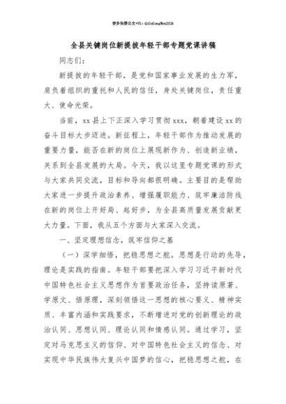 【七哥公文】2025年:【七哥公文】全县关键岗位新提拔年轻干部专题党课讲稿+更多免费公文+VX:QiGeGongWen2024+更多免费公文+VX:QiGeGongWen2024