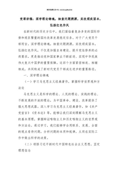 【七哥公文】2025年:【七哥公文】党课讲稿:深学理论铸魂,细查问题溯源,实改顽疾固本,弘扬红色作风+更多免费公文+VX:QiGeGongWen2024+更多免费公文+VX:QiGeGongWen2024