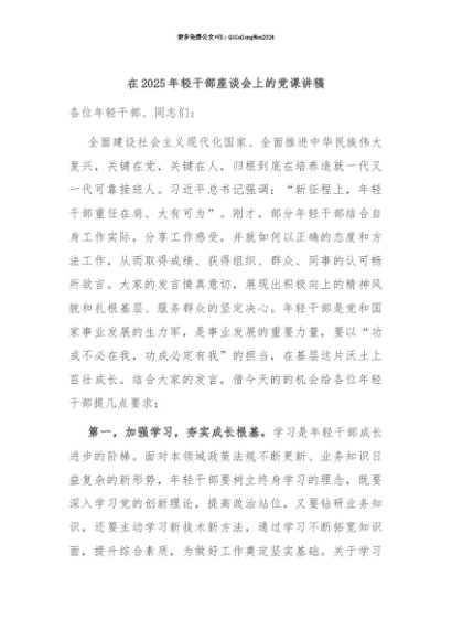 【七哥公文】2025年:【七哥公文】在2025年轻干部座谈会上的党课讲稿+更多免费公文+VX:QiGeGongWen2024+更多免费公文+VX:QiGeGongWen2024