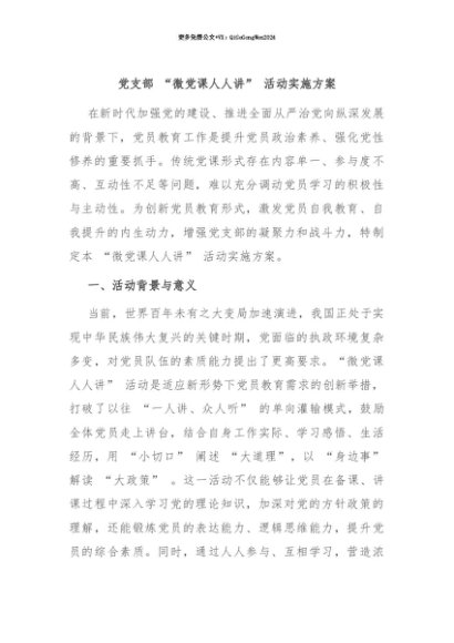 【七哥公文】2025年:【七哥公文】党支部 “微党课人人讲” 活动实施方案+更多免费公文+VX:QiGeGongWen2024+更多免费公文+VX:QiGeGongWen2024