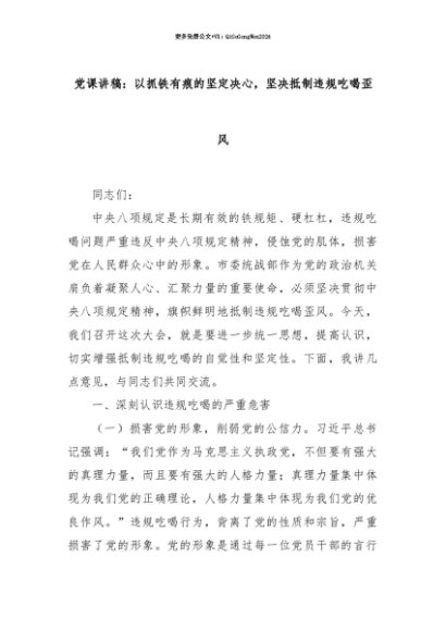 【七哥公文】2025年:【七哥公文】党课讲稿:以抓铁有痕的坚定决心,坚决抵制违规吃喝歪风+更多免费公文+VX:QiGeGongWen2024+更多免费公文+VX:QiGeGongWen2024