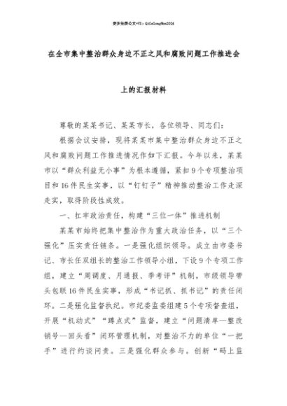 【七哥公文】2025年:【七哥公文】在全市集中整治群众身边不正之风和腐败问题工作推进会上的汇报材料+更多免费公文+VX:QiGeGongWen2024+更多免费公文+VX:QiGeGongWen2024