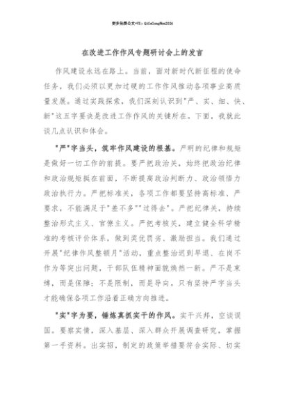 【七哥公文】2025年:【七哥公文】在改进工作作风专题研讨会上的发言+更多免费公文+VX:QiGeGongWen2024+更多免费公文+VX:QiGeGongWen2024
