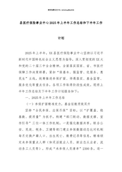 【七哥公文】2025年:【七哥公文】县医疗保险事业中心2025年上半年工作总结和下半年工作计划+更多免费公文+VX:QiGeGongWen2024+更多免费公文+VX:QiGeGongWen2024