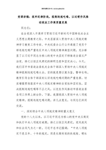 【七哥公文】2025年:【七哥公文】党课讲稿:筑牢纪律防线,抵制违规吃喝,以过硬作风推动政法工作高质量发展+更多免费公文+VX:QiGeGongWen2024+更多免费公文+VX:QiGeGongWen2024