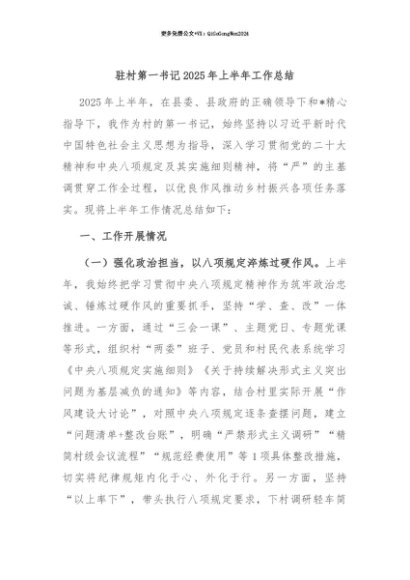【七哥公文】2025年:【七哥公文】驻村第一书记2025年上半年工作总结+更多免费公文+VX:QiGeGongWen2024+更多免费公文+VX:QiGeGongWen2024