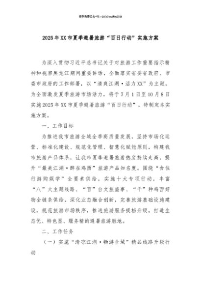 【七哥公文】2025年:【七哥公文】2025年XX市夏季避暑旅游“百日行动”实施方案+更多免费公文+VX:QiGeGongWen2024+更多免费公文+VX:QiGeGongWen2024